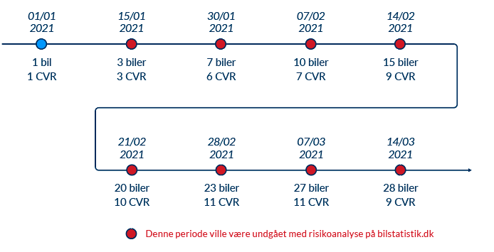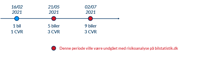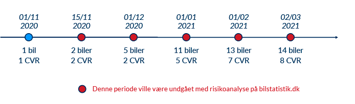 Herunder kan du se eksempler på, hvordan vores nye værktøj til risikoanalyse opfanger mønstre i f.eks. virksomhedsadfærd og bestandsudvikling, der giver anledning til skærpet opmærksomhed. Fælles for alle tre virksomheder er, at de tidligt i processen er blevet markeret som højrisikoemner på Bilstatistik.