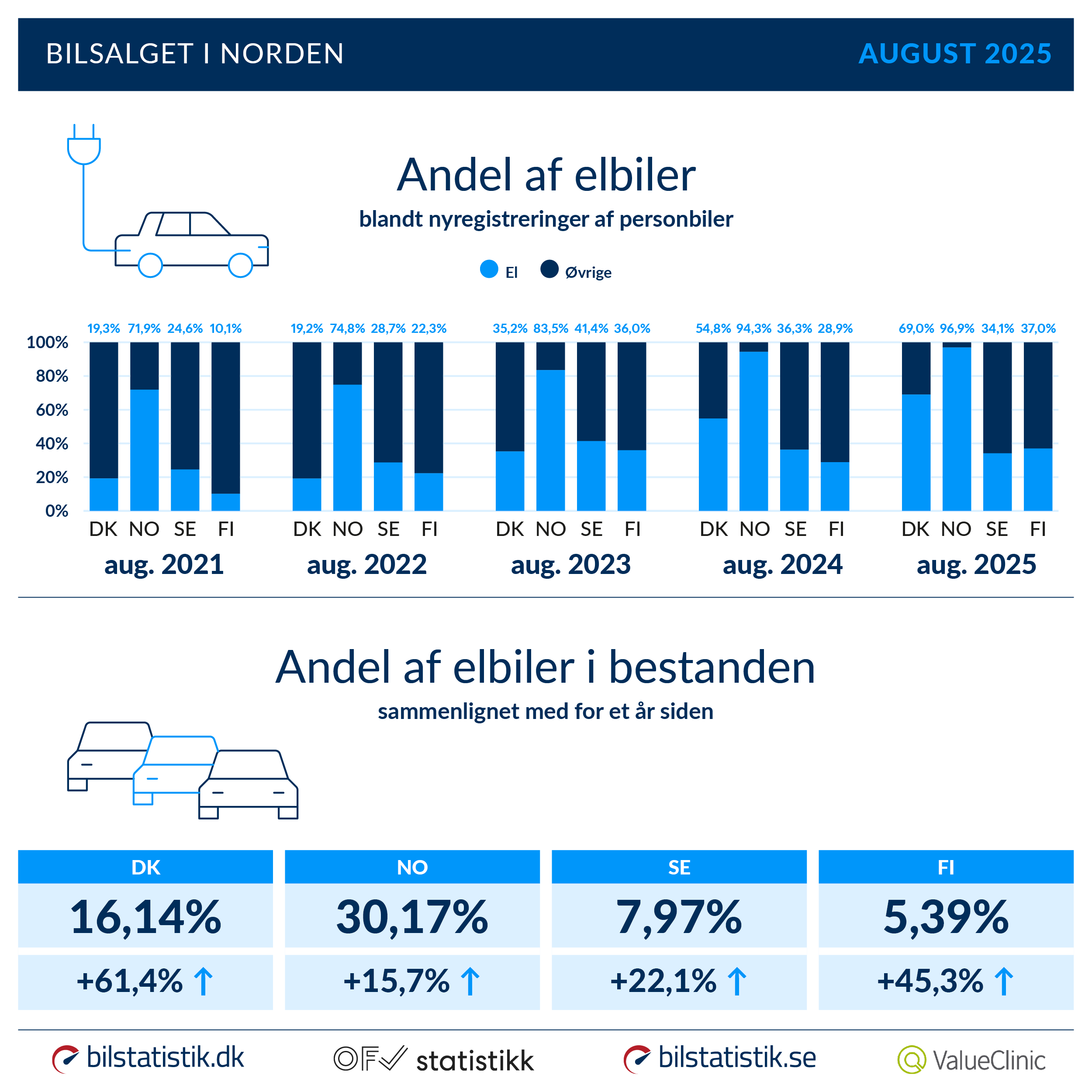 Anderledes opløftende ser det ud på de resterende tre markeder. I Norge fyldte elbilregistreringerne 96,9 % i august (+ 2,8 % ift. august 2024), i Danmark 69 % (+25,9 %) og i Finland 37 % (+28 %). Dermed har de ellers hybrid-elskende finner overhalet de svenske elbilandele i august.