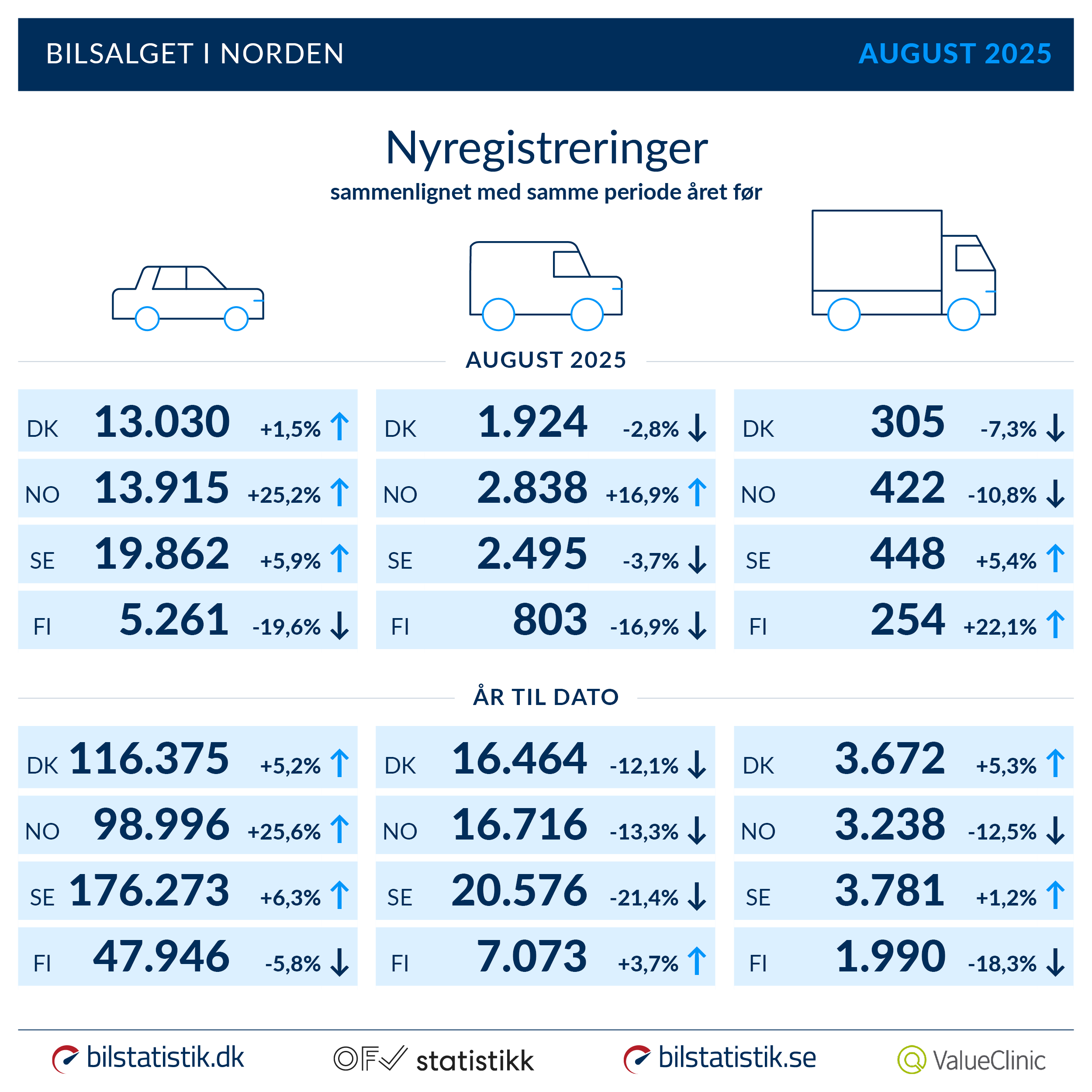 August bød på fremgang for personbilerne på tre ud af fire markeder i Norden, hvor kun Finland måtte acceptere et salg, der igen slog i bakgear. Med 5.261 nyregistreringer går de knap 20 % tilbage i forhold til august sidste år. Anderledes god stemning er der nok i Norge, hvor sidste års skræktal blev pyntet med en stigning på 25 % svarende til i alt 13.915 nyregistreringer. Med 19.862 nye biler på vejene havde svenskerne en fremgang på 5,9 %, mens Danmark på trods af manglende afklaring omkring registreringsafgifter gik 1,5 % frem og landede på 13.030 nyregistreringer.