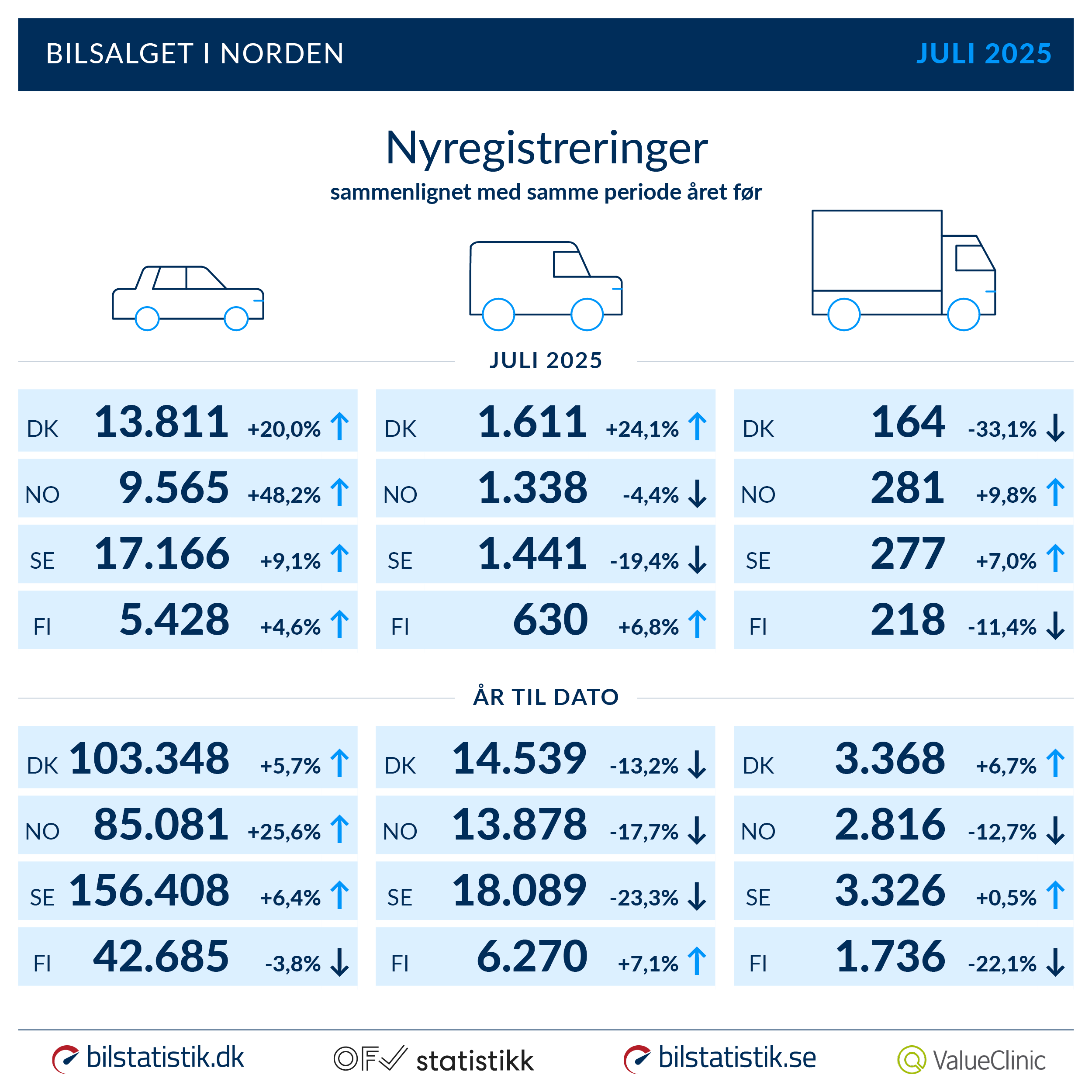 Danmark, Sverige, Norge og Finland oplevede alle en flot fremgang for personbilerne i juli. Det betyder samtidig, at alle lande er i plus for året, fraset Finland der dog er snublende tæt på. De er til gengæld det eneste marked, der ikke har røde tal for varebilerne i 2025.