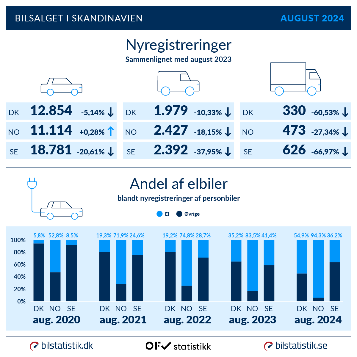 Der var ikke megen sommerstemning over det skandinaviske nybilsalg i august. Den eneste grønne pil vi finder i den forgangne måned er ud for de norske personbiler, der ligger en lille halv procent over niveauet i august 2023. Værre ser det ud hos naboerne i både Danmark og Sverige, som må se sit augustsalg slået med henholdsvis 5 % og godt 20 %.
