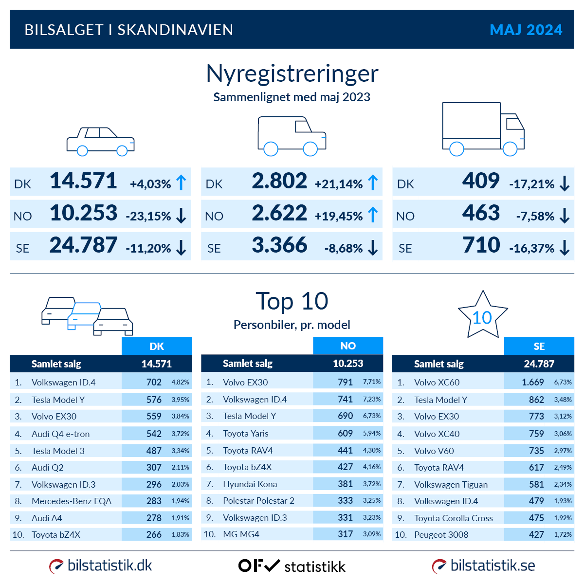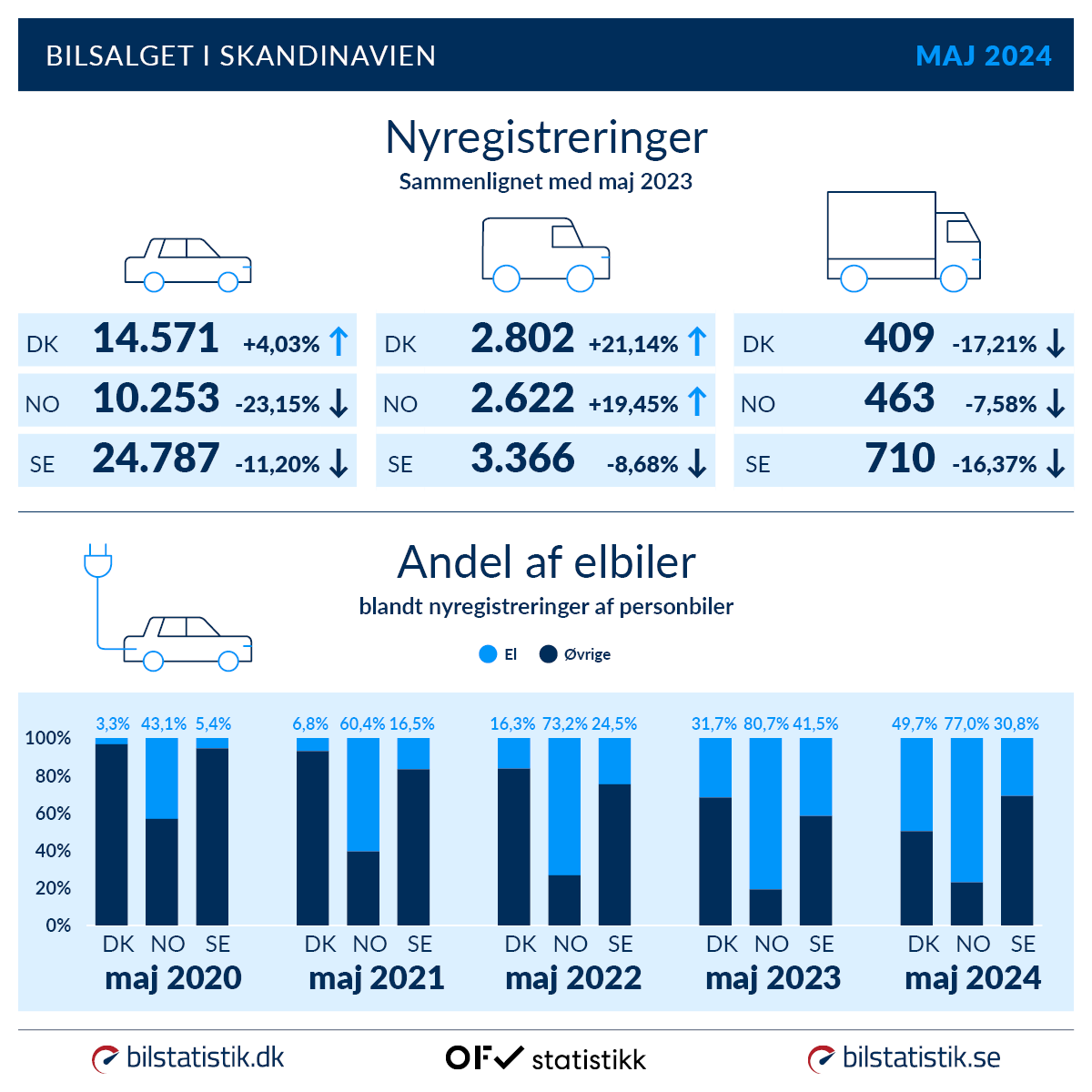 I maj måned var det kun danskerne, der oplevede en fremgang i nybilsalget, mens både Sverige og Norge måtte se nyregistreringerne slå bak. Størst var tilbagegangen i Norge med et fald på 23 %, efter følger Sverige med et fald på 11 %, mens Danmark klarer sig med skindet på næsen og en beskeden stigning på 4 % sammenlignet med maj 2023.