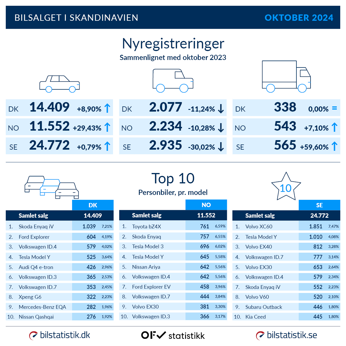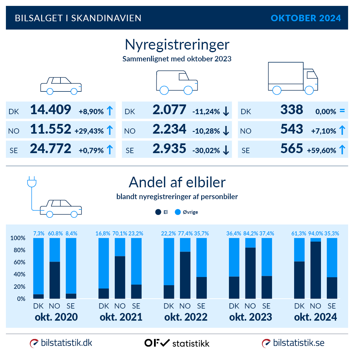 Der er grønne tal for personbilerne over hele den skandinaviske linje. Størst er væksten i Norge med en stigning på 29,4 %, Danmark følger efter med en nyregistreringsvækst på 8,9 %, mens Sverige akkurat kravler over niveauet fra oktober 2023 med en vækst på 0,8 %.
